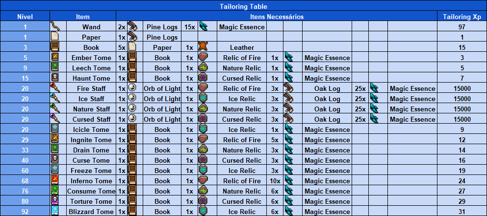 Para craftar os livros de feitiço (Magic Tome) é necessário ter 3 itens diferentes, livros em branco, Magic Essence e alguma Relic de Fire, Nature, Cursed ou Ice. A quantidade de relics e livros gastos permanecerá sempre a mesma, porém a quantidade de essenciais pode variar de 1 a 10 por craft, e cada craft gera sempre 5 livros de feitiço.